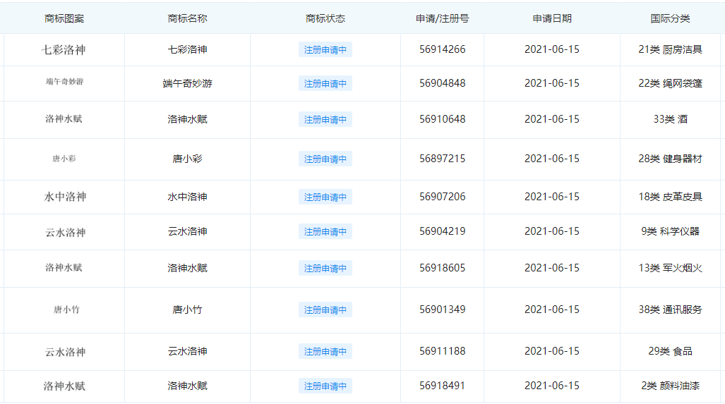端午节过后的第一天,河南广播电视台就提交了“洛神水赋”、“七彩洛神”、“云水洛神”、“水下飞天”、“唐小可”、“唐小玉”、“端午奇妙游”等商标注册申请,一口气注册了200多件。