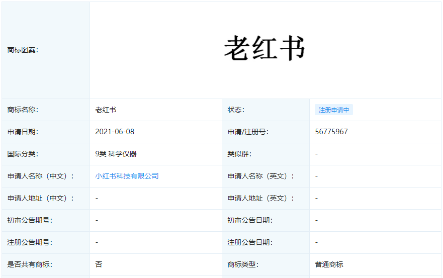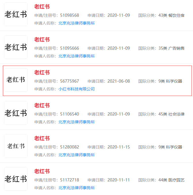 根据查询,2020年11月北京兆法律师事务所申请了5件“老红书”商标,分别注册在9类-科学仪器、35类-广告销售、44类-医疗园艺等类别。其中,有3件已经初审公告。