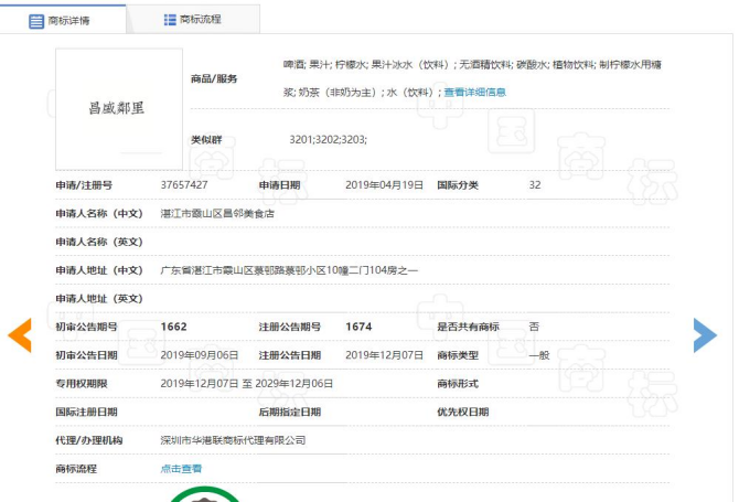 对于许多专业人士,都知道,餐饮门店的核心商标不是32类而是43类餐饮服务业,所以这个“昌盛邻里”商标仅仅注册了饮料类别,没有43类是不行的!当然加上35类更是绝配!