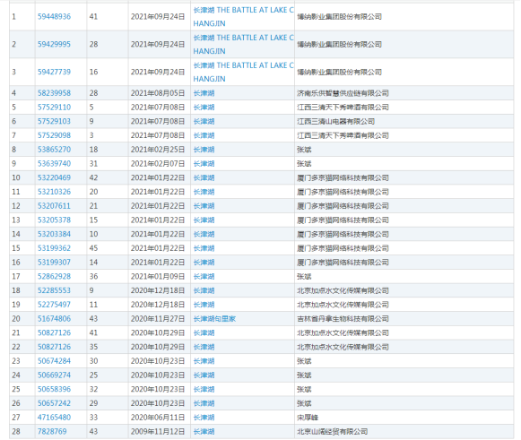 小编又查询了下,好家伙,截至目前“长津湖”商标几十个类目已被多个自然人及公司申请注册,国际分类含社会服务、服装鞋帽等,申请人包括厦门多京猫网络科技有限公司等,目前商标状态多为“商标已注册”“等待实质审查”。
