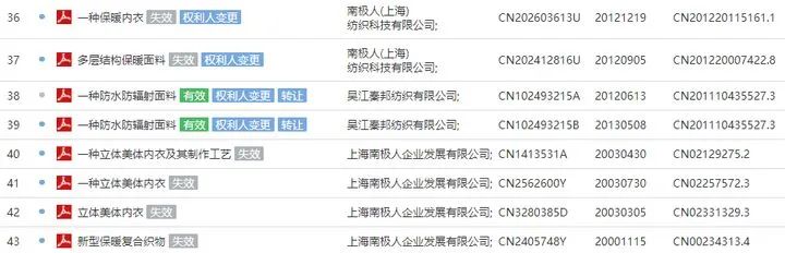 首先在技术方面,1997年南极人以首创“保暖内衣”出道,早期生产经营时申请了大批的保暖技术专利,这大大提升了其在保暖内衣领域的科技创新竞争力,也为品牌形象竖起了坚实的保护盾。当然目前这些专利大部分已失效,如下图: