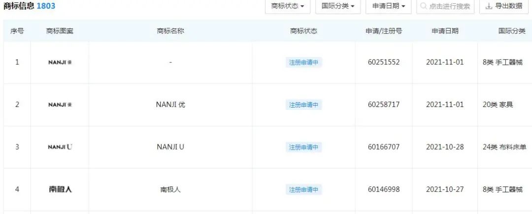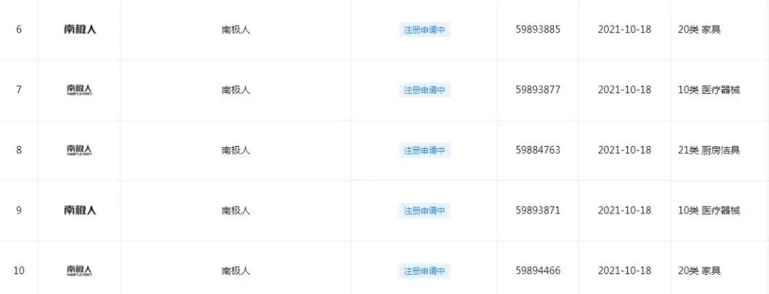 就在今年10月份,南极电商主体还在申请“南极人”系列新商标。