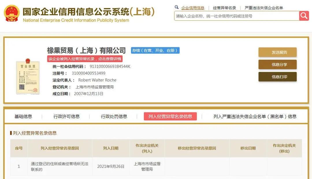 记者在国家企业信用信息公示系统查询发现,运营背背佳的母公司橡果贸易于2021年9月被上海市市场监管局列入经营异常名录,原因是通过登记的住所或者经营场所无法联系。