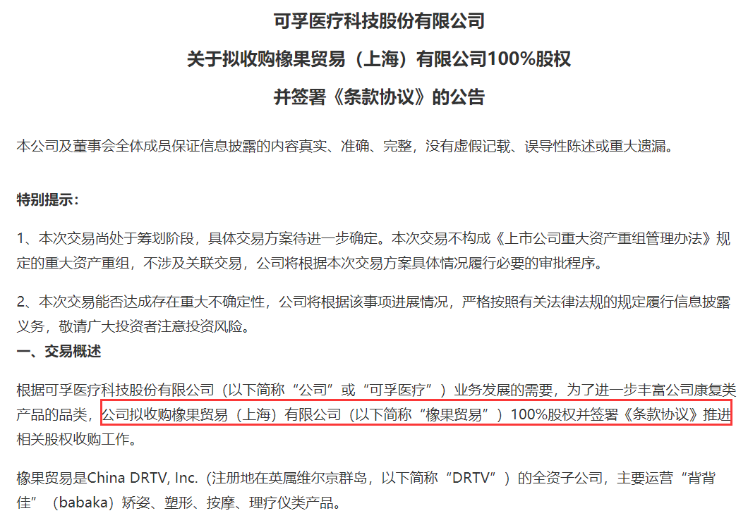 11月7日晚,可孚医疗发布公告称,公司将以总计价款不超过人民币1.77亿元收购橡果贸易(上海)有限公司(以下简称“橡果贸易”)100%的股权及其关联公司中与“背背佳”相关的知识产权。