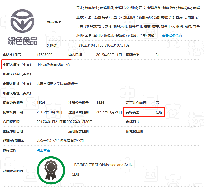 国家知识产权局商标局信息显示,“绿色食品”商标由中国绿色食品发展中心申请,商标类型为证明商标。因此,只要某生产商的产品达到了国家和中国绿色食品发展中心所要求的“绿色食品”标准,那么不管该商户在哪个城市,提出相应手续,都可以使用该商标。