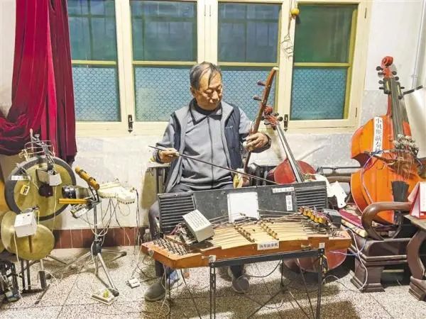 拉出扬琴下的凳子,端起立在一旁的板胡,脚踩暴鼓下的合成键盘。暴鼓骤响,大锣、小锣、梆子紧随其后,秦腔武场面的音乐咣咣当当演奏起来。“我是个老陕,就爱听个秦腔、唱个秦腔,但自乐班最少也得五六个人,经常凑不齐,没法唱。后来,我发明了这个秦腔电动打击乐器,通过装在板胡上的微型键盘控制,一个人就是一个自乐班。现在,老伙伴们没事就来我家唱戏,我一个人负责吹拉弹,他们负责唱就行。”辛世武说。