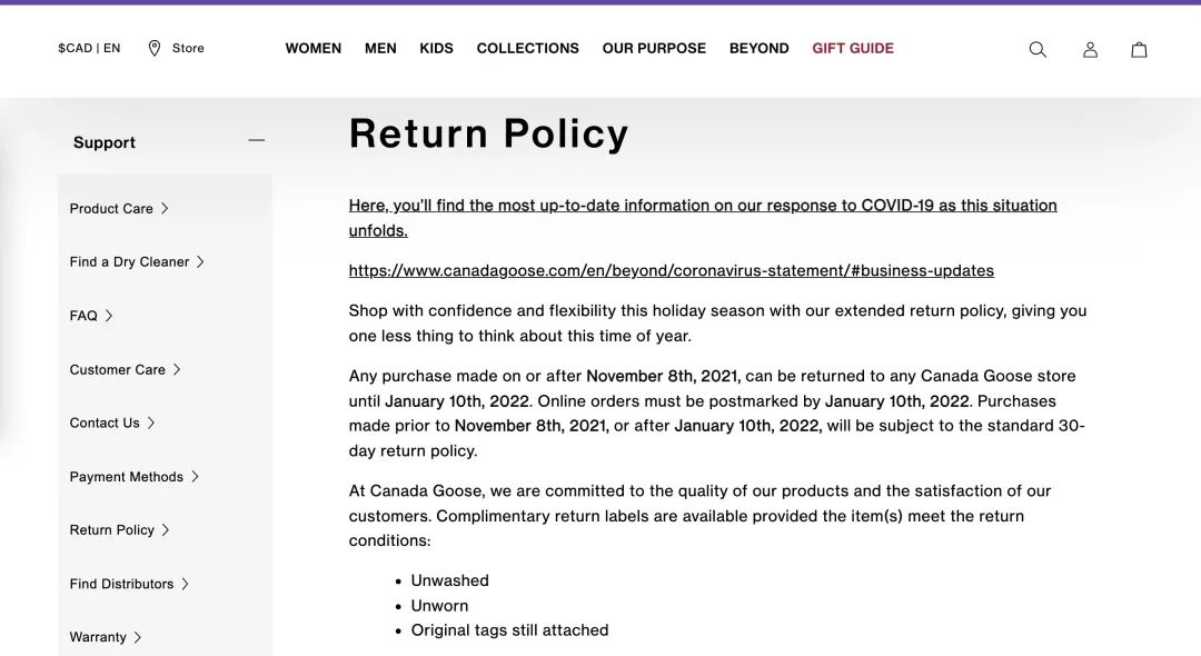 在网购平台上,加拿大鹅官方旗舰店承诺,所售商品均支持7天无理由退换货。据加拿大鹅官网发布的内容,加拿大鹅在加拿大、美国、新西兰、芬兰等国家均支持30天内无理由退换货。值得注意的是,目前,在加拿大鹅中文官网中,其退换货规定页面已无法打开。