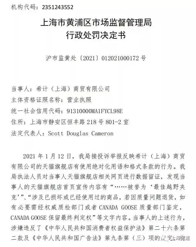 2021年6月,加拿大鹅的国内经营公司希计(上海)商贸有限公司因利用广告对商品或服务作虚假宣传,欺骗和误导消费者,被上海市黄浦区市场监督管理局罚款45万元。该事件当时还上了热搜。
