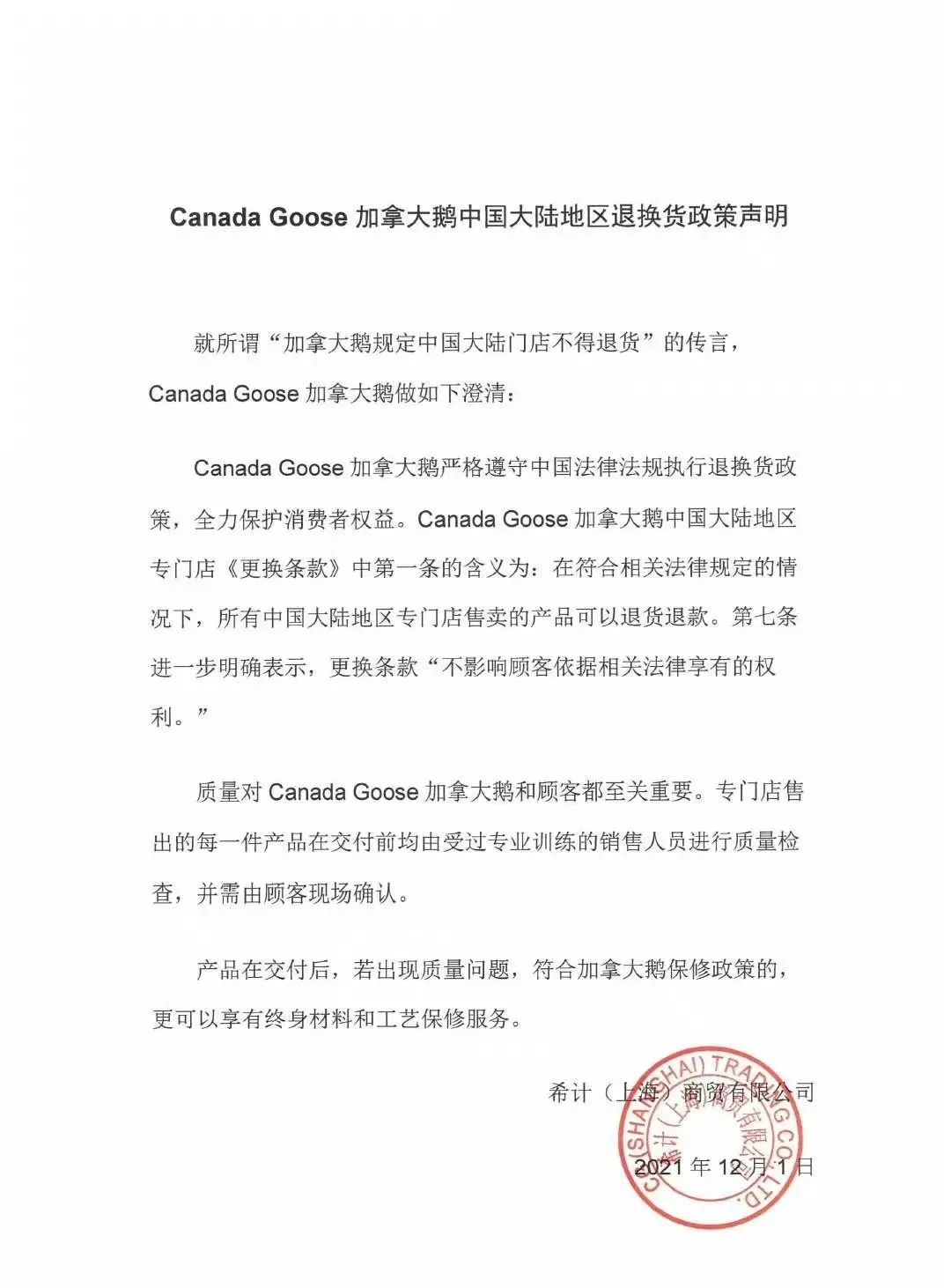 12月1日上午,加拿大鹅发布声明称,在符合相关法律规定的情况下,所有中国大陆地区专门店售卖的产品可以退货退款。该声明并未直接回复外界的质疑。