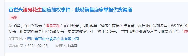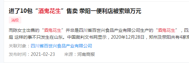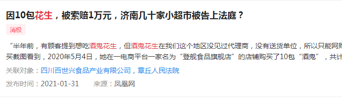 据《山东商报》此前报道,济南市章丘区的陈女士,因花70.02元网购10包“酒鬼花生”在店内售卖,被四川省百世兴食品产业有限公司以侵权为由告上法庭,并要求赔偿数万元。