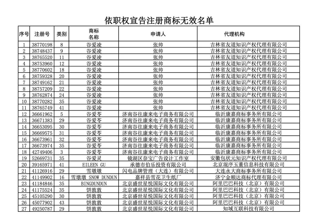 包括11件“谷爱凌”商标在内的已注册商标被无效宣告。