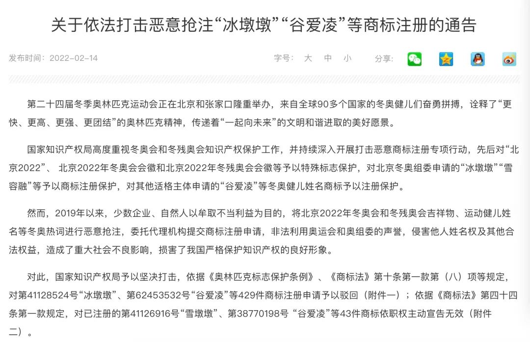 通告称,2019年以来,少数企业、自然人以牟取不当利益为目的,将北京2022年冬奥会和冬残奥会吉祥物、运动健儿姓名等冬奥热词进行恶意抢注,国家知识产权局予以坚决打击,依据《奥林匹克标志保护条例》《商标法》第十条第一款第(八)项等规定,对第41128524号“冰墩墩”、第62453532号“谷爱凌”等429件商标注册申请予以驳回;依据《商标法》第四十四条第一款规定,对已注册的第41126916号“雪墩墩”、第38770198号 “谷爱凌”等43件商标依职权主动宣告无效。